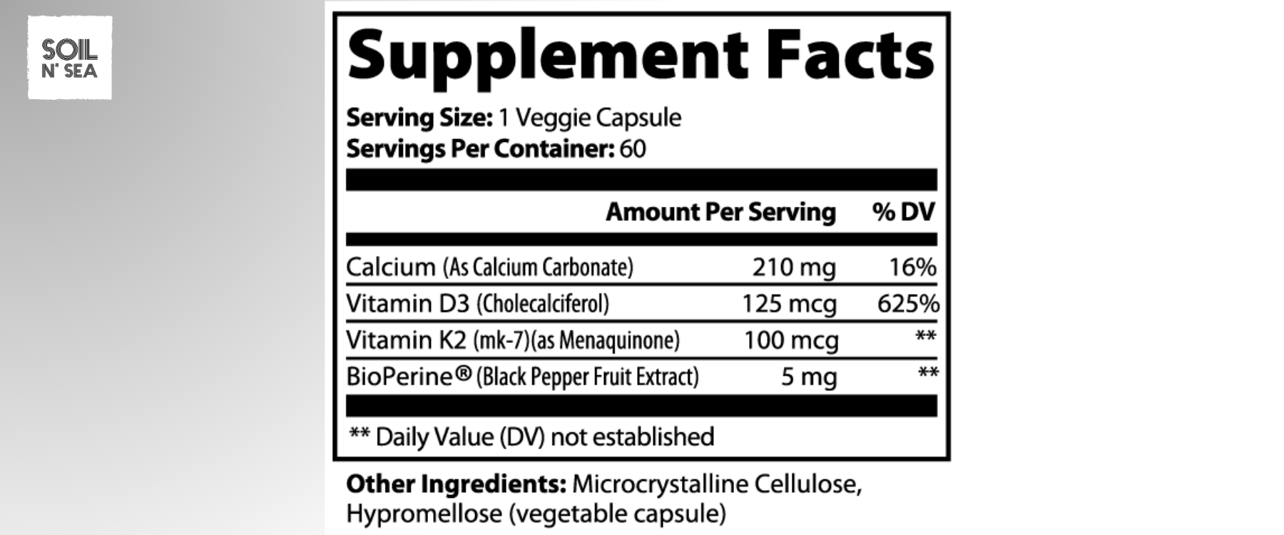 Ingredients: Calcium (as Calcium Carbonate), Vitamin D3 (Cholecalciferol), Vitamin K2 (mk-7)(as Menaquinone), BioPerine® (Black Pepper Fruit Extract), Microcrystalline Cellulose, Hypromellose (vegetable capsule).