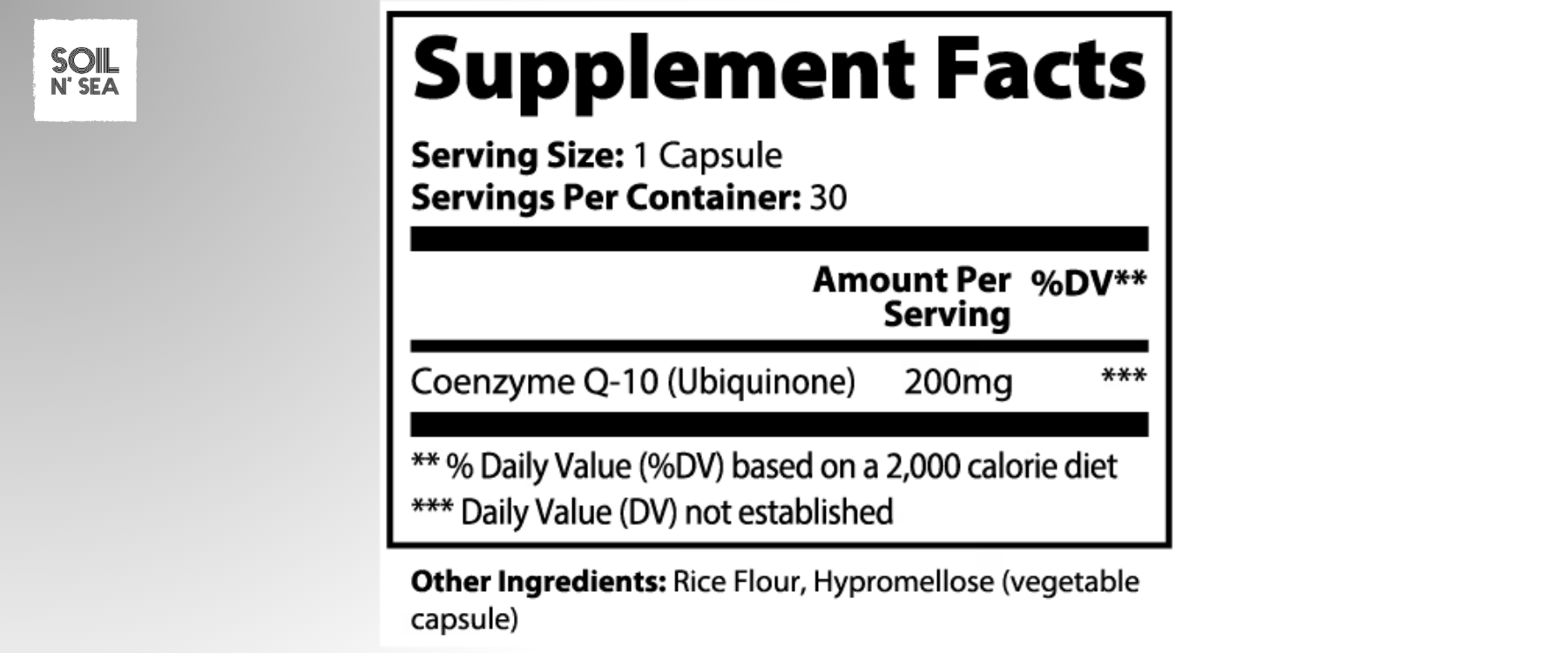Ingredients: Coenzyme Q-10 (Ubiquinone), Hypromellose (vegetable capsule), Rice Flour.