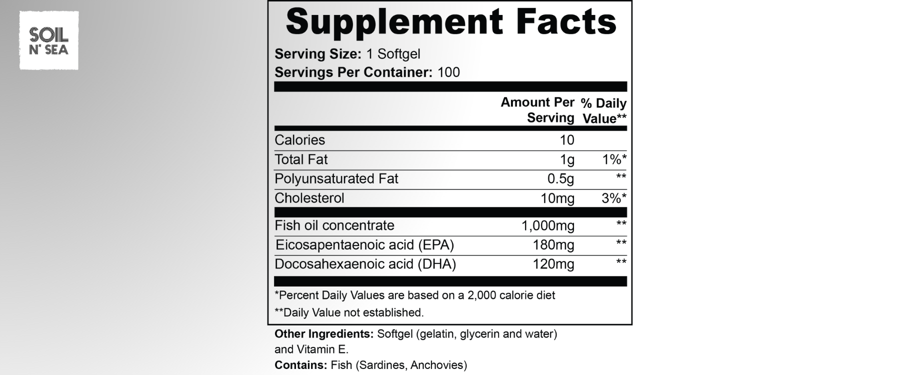 Ingredients: Fish oil concentrate, Eicosapentaenoic acid (EPA), Docosahexaenoic acid (DHA), softgel (gelatin, glycerin and water), Vitamin E.